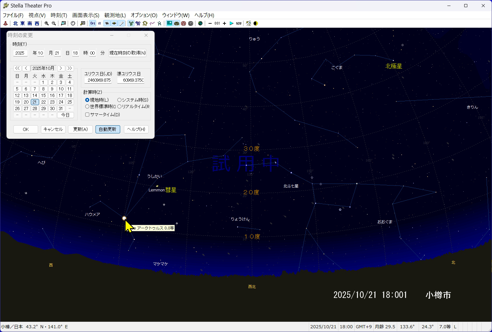 続 彗星情報 10月21日18時の小樽での見える位置の図です。 私のシュミレーション画像です。 西北西の空にやや低めにあり 次第に沈みます。観察は 低倍率広角の双眼鏡が 最適かと思います。撮影は タイムラプス撮影か 長時間露出 当然三脚使用 で!天候がよく レモン彗星 を 観望・撮影できますように! 投稿者134 谷村典彦 投稿日2025/10/03(Fri) 19:02 No.3972