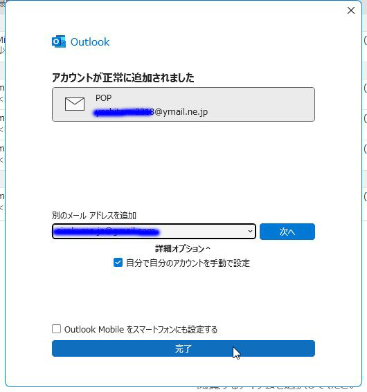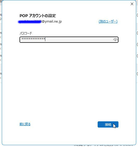続 Outlook(Classic) POPでアカウント作成 「POP」をクリック 投稿者松本 投稿日2025/11/07(Fri) 14:39 No.561 続 Outlook(Classic) POPでアカウント作成 パスワードを入力「接続」をクリック 投稿者松本 投稿日2025/11/07(Fri) 14:40 No.562 続 Outlook(Classic) POPでアカウント作成 POPアカウントの設定内容を記入 「次へ」をクリック 投稿者松本 投稿日2025/11/07(Fri) 14:41 No.563 続 Outlook(Classic) POPでアカウント作成 アカウントが正常に追加されるとOK 「完了」をクリック 投稿者松本 投稿日2025/11/07(Fri) 14:42 No.564